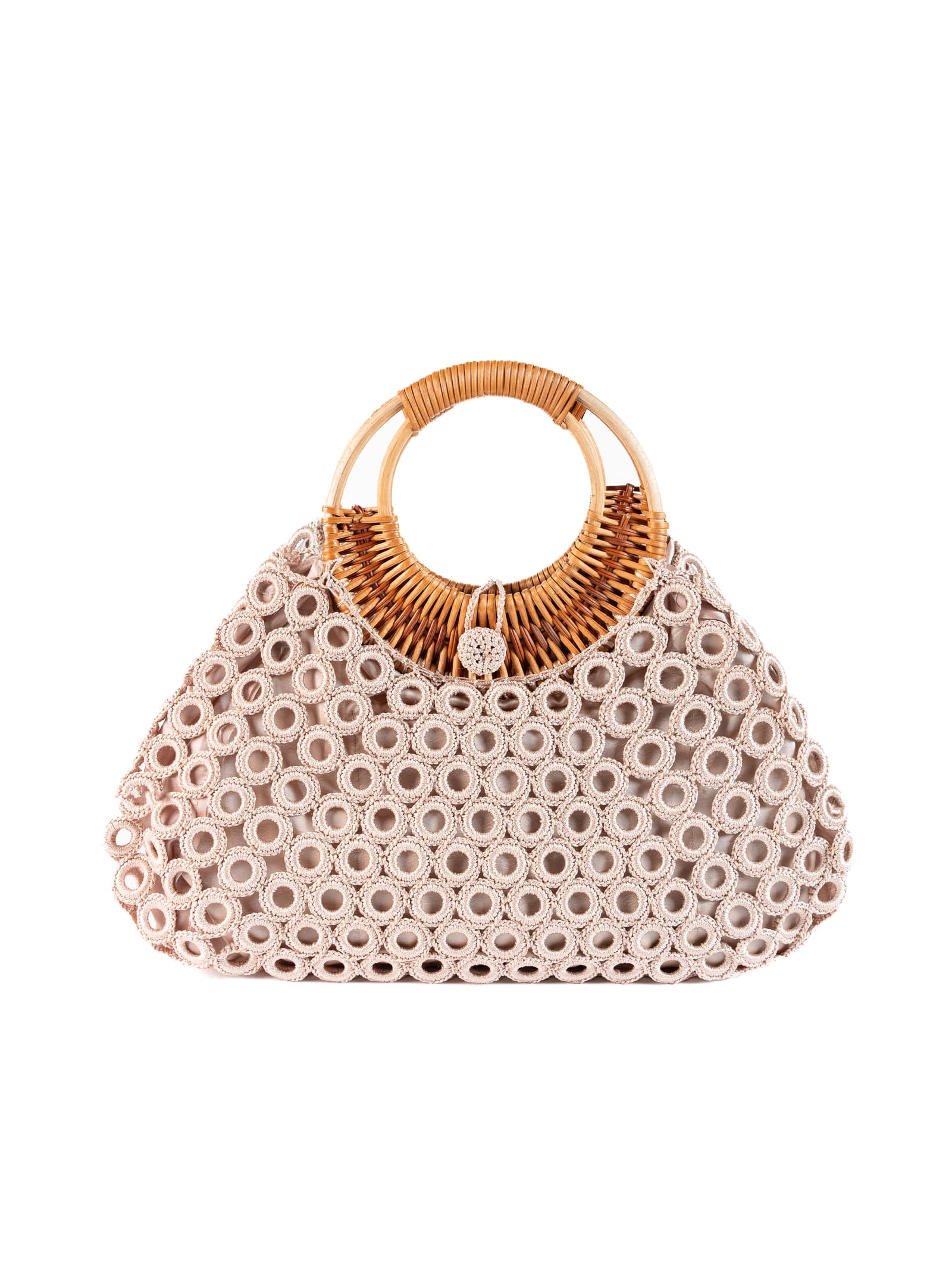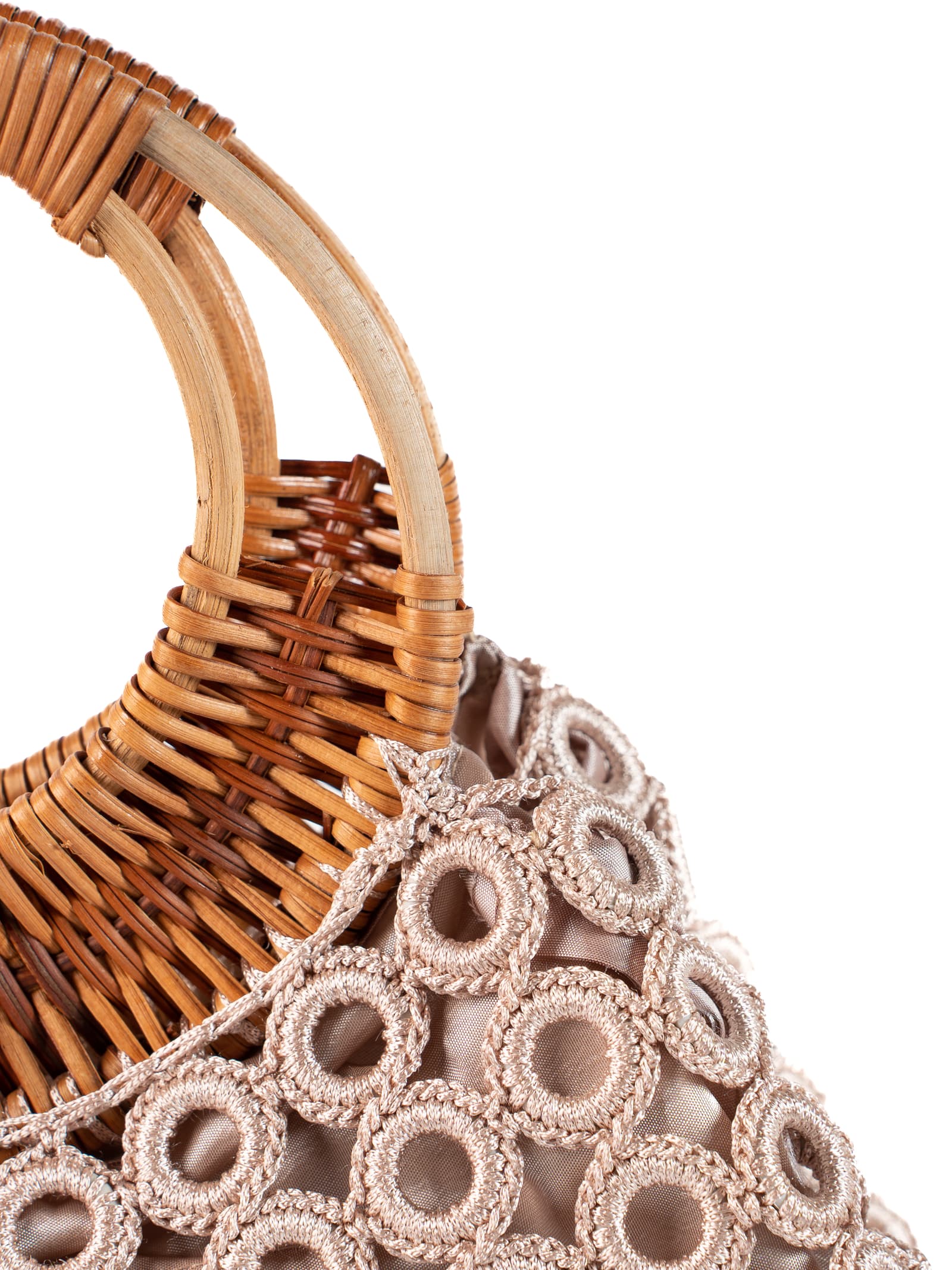 The distinctive character is emphasized by the wide, circular handle in genuine rattan, whose natural texture blends harmoniously with the softness of the bag, lending an exotic and sophisticated aesthetic. It's the perfect accessory for those seeking a statement piece, capable of elevating both an urban look and a vacation outfit.