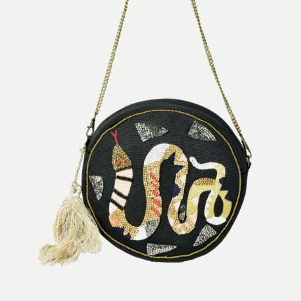 PURE.R FISHES: Pochette round ricamata a mano con perline e tessuto colorati; tracolla in metallo; chiusura zip. Diametro: 20 cm. Nappa in seta abbinata di 16 cm.